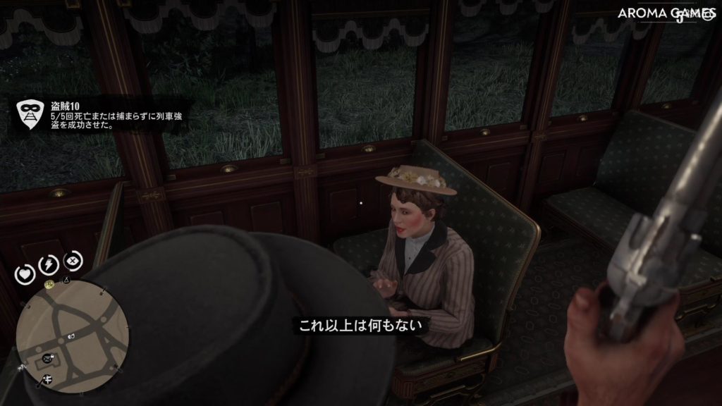 7つ目の「町民と旅人から50ドル分の現金や貴重品を盗め」はその辺にいる人を狙うと金額が少ないため、列車強盗で達成しましょう。