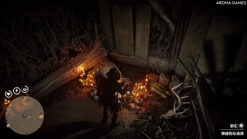 “神秘的な液体”という表記で飲むことができるのだが、飲むと気絶して小屋のすぐ傍で目が覚める。所持金が減るということも能力が上がるということもなく、ただ単にステータスが回復している。